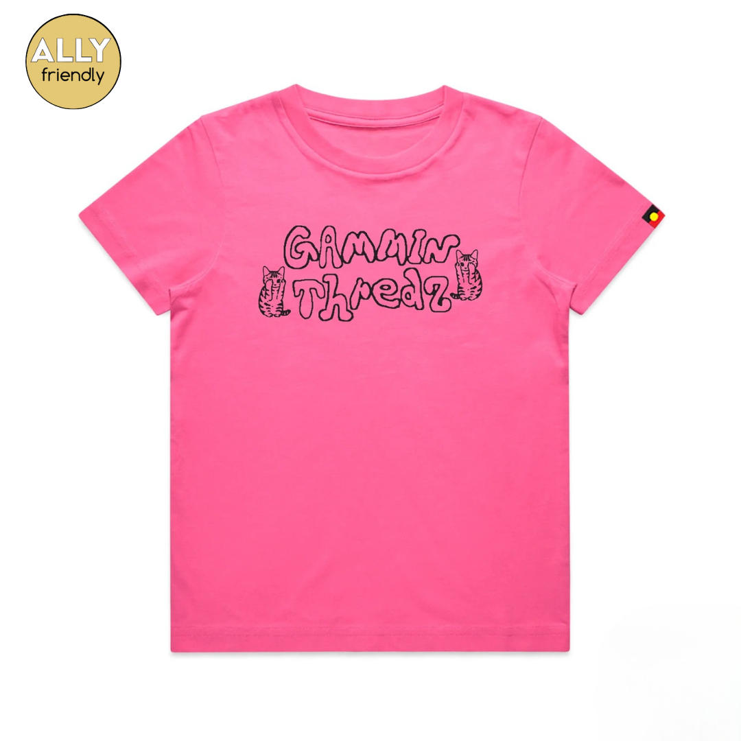 Screen printed on a soft combed hot pink cotton jersey tee.